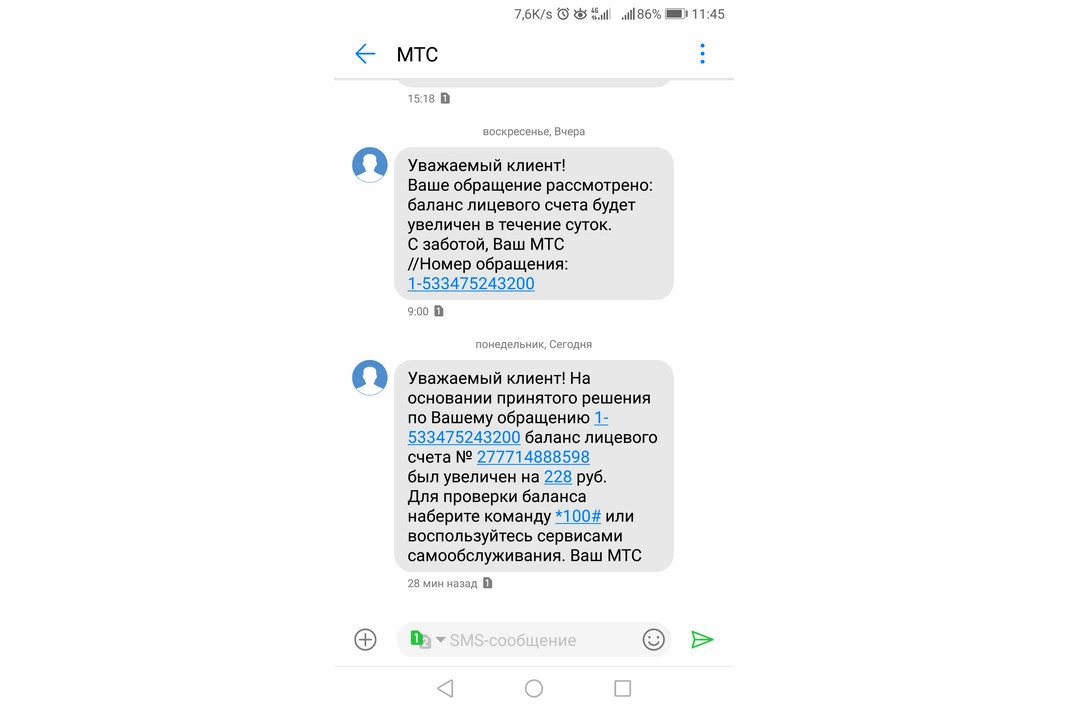 Прекрасно, не правда ли? Особенно, полное игнорирование просьбы разделить счета. На следующий день на мой основной номер пришла СМС, что обращение рассмотрено, а вчера на счёт вернули 228 рублей.