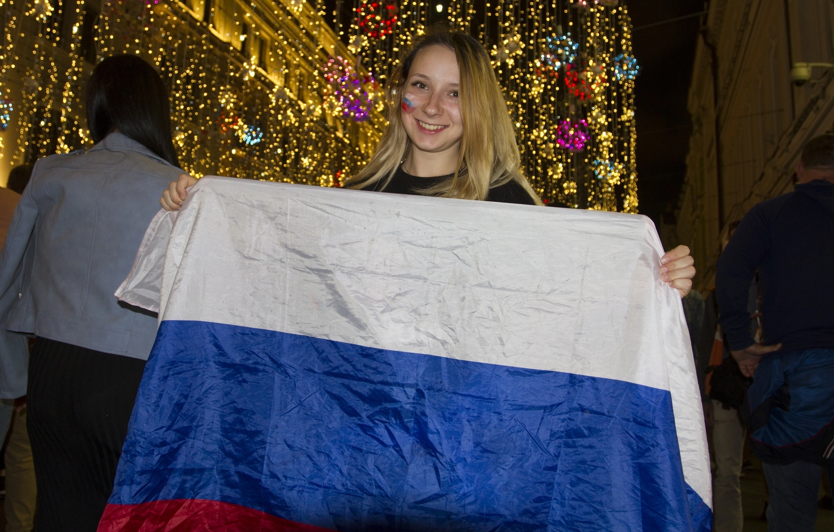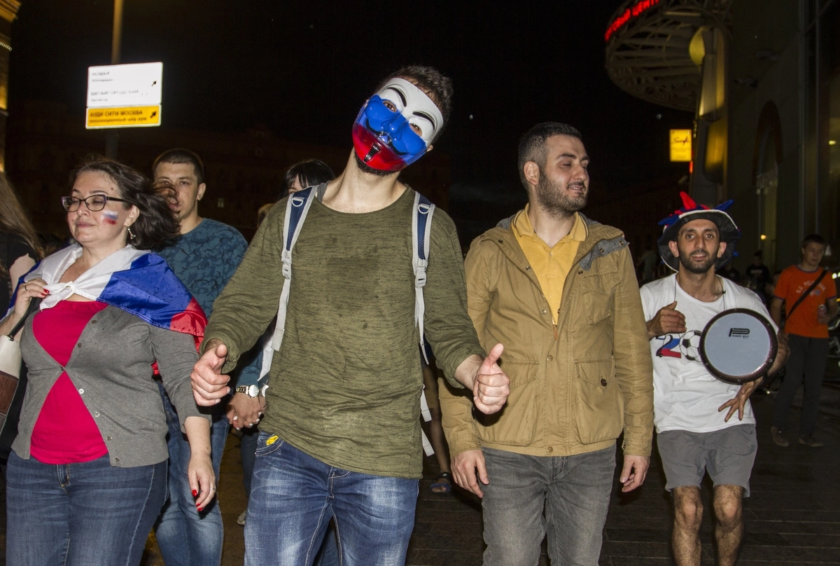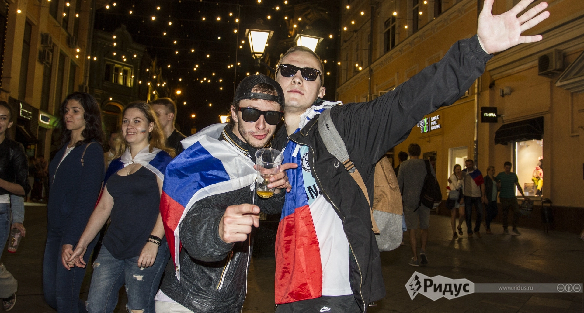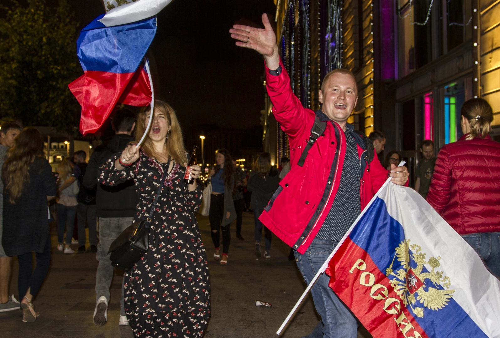 Сотни людей вышли отметить великолепную игру сборной России в ¼ финала чемпионата мира против сборной Хорватии.