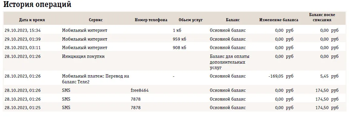 В детализации всё интересно: в 1:25 СМС на короткий номер 7878, в 1:26 ещё одна СМС туда же, в ту же минуту СМС на странный номер free8464, затем в ту же минуту мобильный перевод, затем какая-то «инициация покупки».