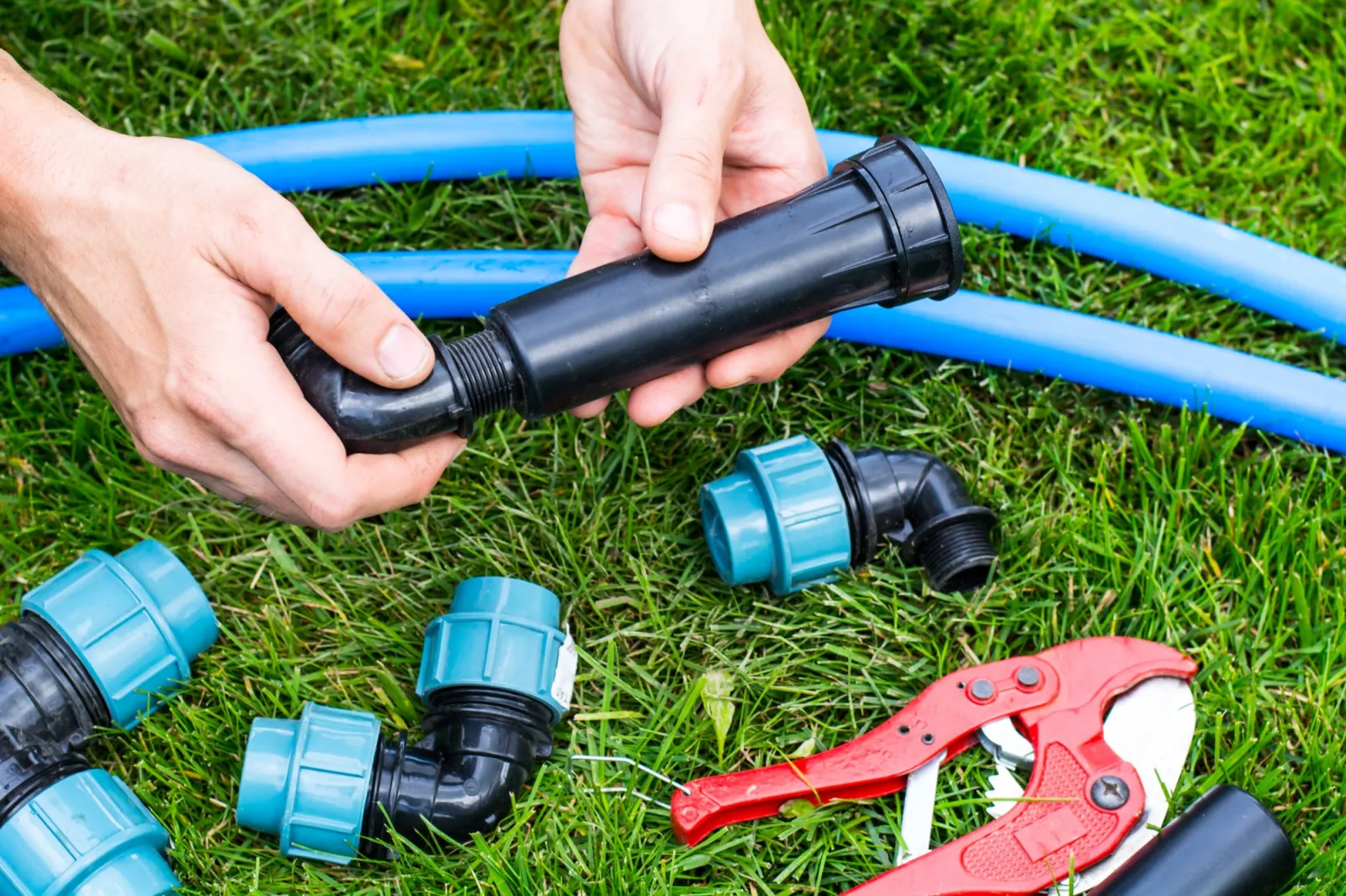 Оптимальным материалом для организации подводящей магистрали служит та же труба ПНД. Однако, в отличие от капельной системы, из ПНД собирают не только магистраль от насоса до газона, но и всю разветвленную сеть, питающую дождеватели. Сеть трубопроводов собирают с применением фитингов, муфт и переходников для труб ПНД.