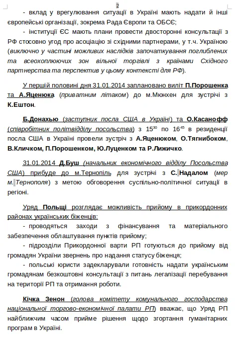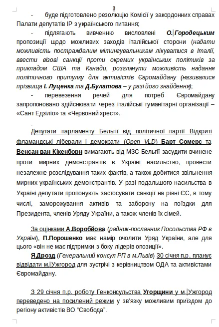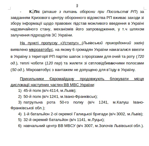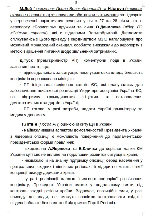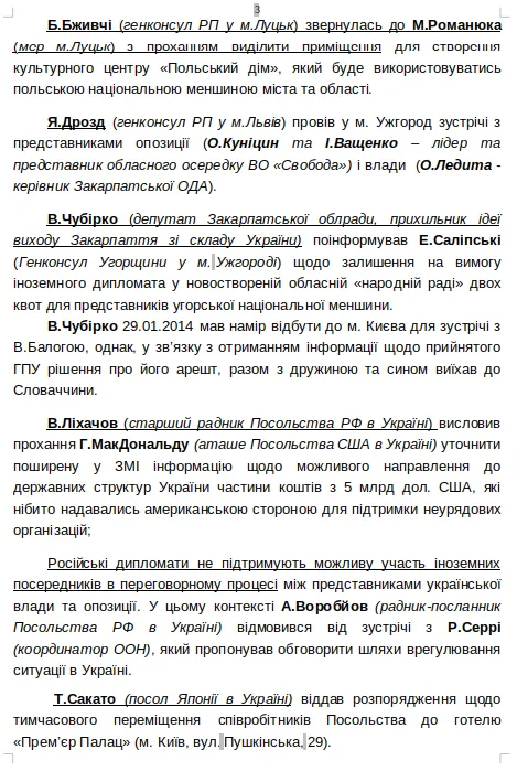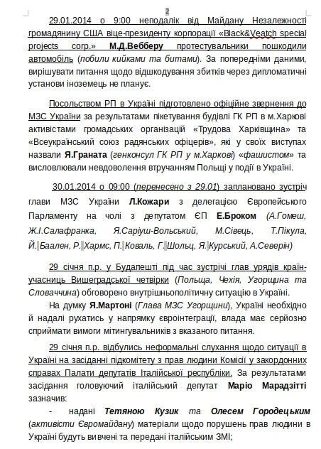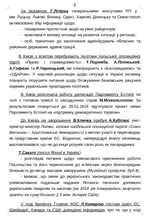 Так, по указанию посла Польши в Украине Г.Литвина генеральными консулами РП в городах Луцке, Львове, Виннице, Одессе, Харькове, Донецке и Севастополе активизирован сбор информации о расширении масштабов протестов и о возможностях оппозиции влиять на ситуацию в регионах.