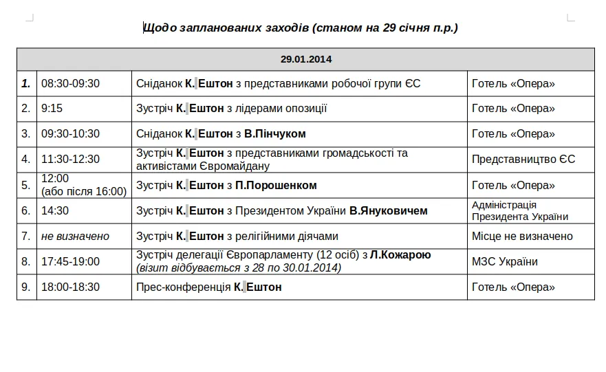 28 января в Киев прибыла Кэтрин Эштон, верховный представитель Европейского союза по иностранным делам и политике безопасности. 29 января она провела встречу с президентом Украины Януковичем, после чего она провела встречи с представителями оппозиции Русланой Лыжичко, Мустафой Наемом. А после них — с Петром Порошенко.