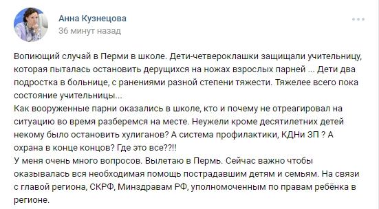 Уполномоченный по правам ребенка при президенте РФ Анна Кузнецова сообщила, что вылетает на место ЧП, и пообещала разобраться, как в школе оказались вооруженные люди.