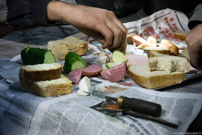 Обедают мужики прямо под землей, на обычной газетке раскладывают колбаску, огурчики и хлеб.