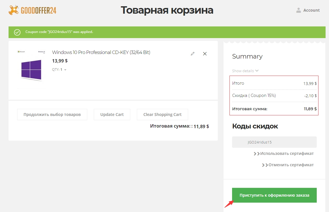Находясь в корзине, вставьте промокод JGO24ridus15 в окно «Discount Codes» и кликните на клавишу «Применить купон». Скидка будет автоматически вычтена из общей стоимости покупок.