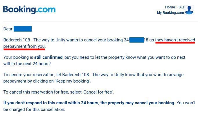 Через какое-то время мне приходит из Букинга сообщение, что владелец гостиницы собирается отменить бронирование, поскольку якобы не получил от меня оплату. Такого быть не может, все оплачено.