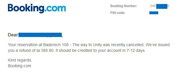 И сразу же третье сообщение об Букинга, что хозяин гостиницы согласился отменить моё бронирование (о чем я его не просил) и вернуть мне деньги. В сообщении также написано, что деньги должны вернуться на карточку в течение 7−12 рабочих дней. Прошло три дня, деньги все еще не вернулись.