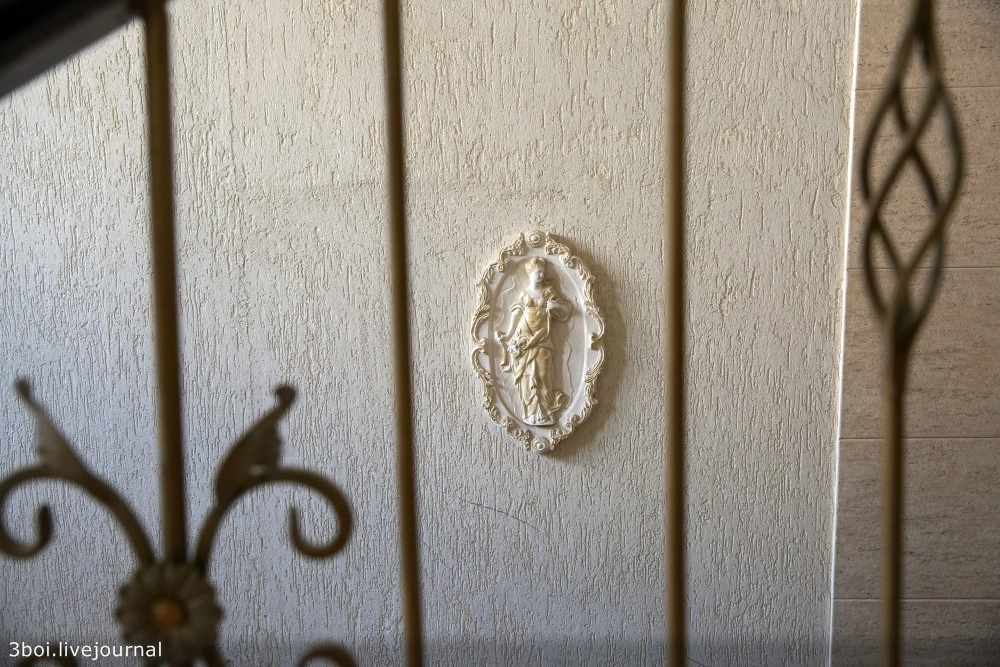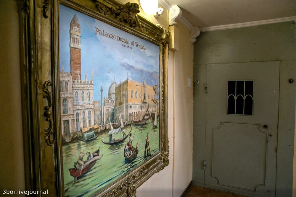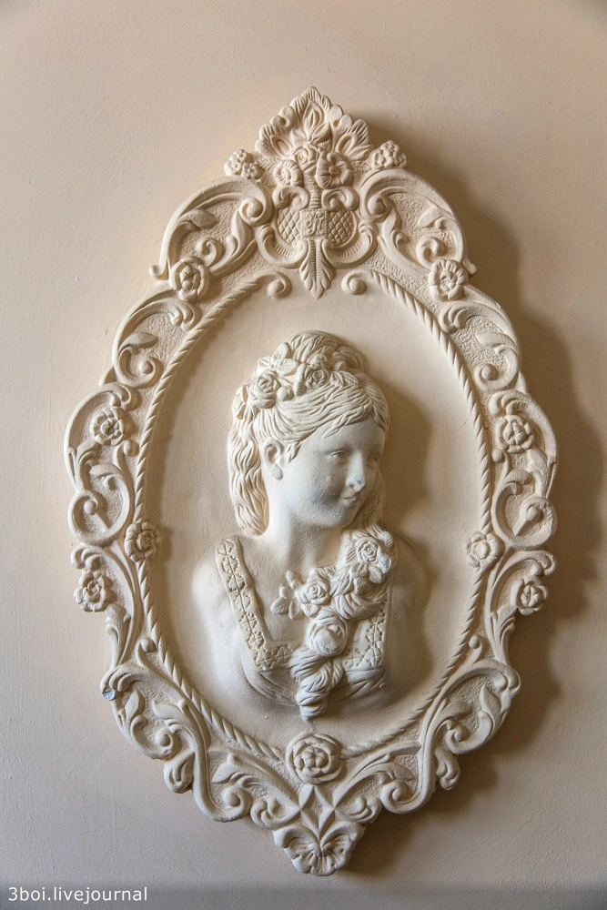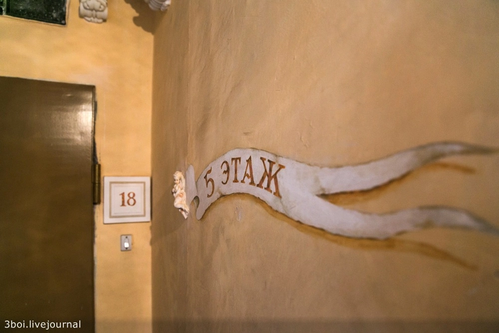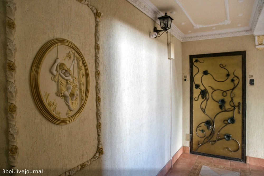 Этажи, лестничные пролеты, лифт, двери украшает неистовая эклектика из гипсовых барельефов в стиле барокко, выкованных металлических украшений, видов Венеции в золоченых рамах, картин по мотивам Левитана, Моне и Семирадского.
