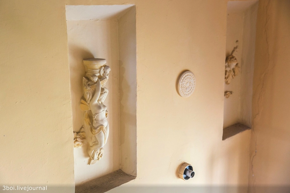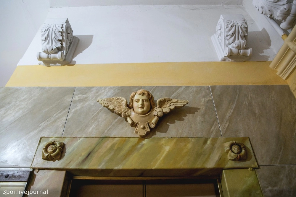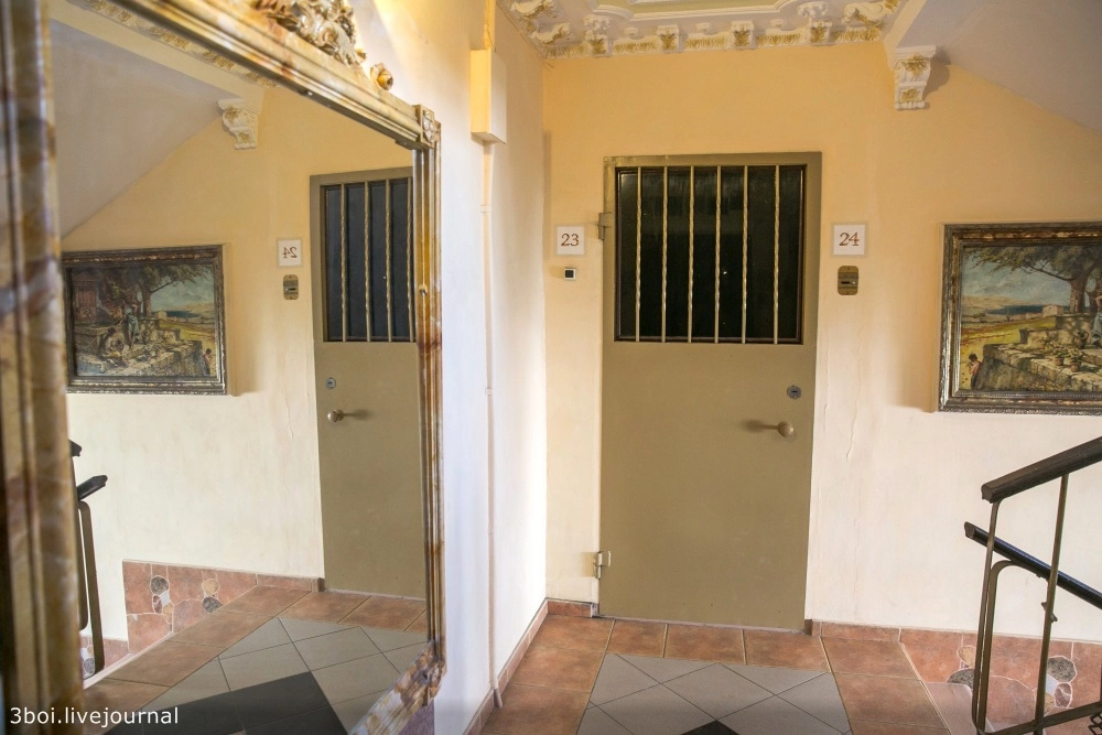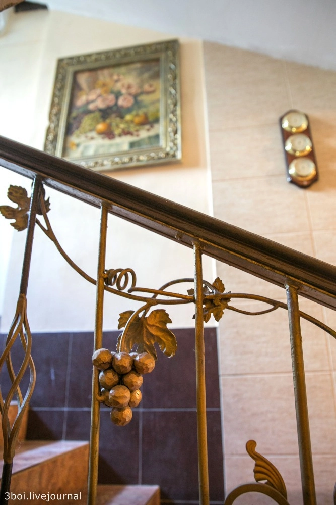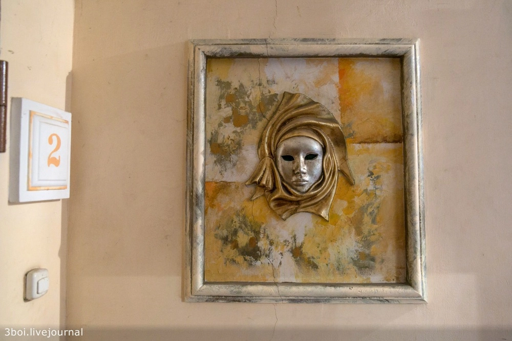 Этажи, лестничные пролеты, лифт, двери украшает неистовая эклектика из гипсовых барельефов в стиле барокко, выкованных металлических украшений, видов Венеции в золоченых рамах, картин по мотивам Левитана, Моне и Семирадского.