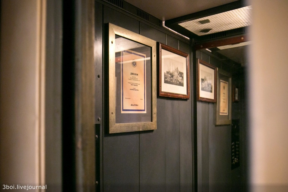 Внутри лифта висят дипломы и старые фотографии в рамках.