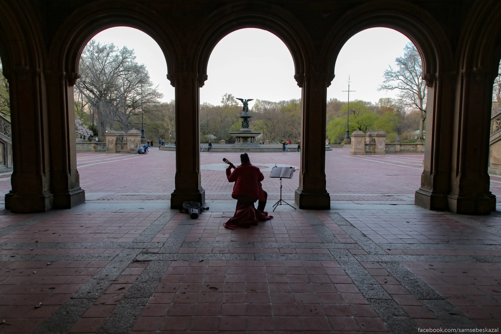 Вечером в Центральном парке почти не было людей, что очень необычно. Восемь вечера, а на дорожках никого. Нет ни шума машин, доносящегося обычно с окружающих улиц, ни голосов тысяч людей, ни гула вертолетов пролетающих над головой. Только шум ветра играющего в молодой листве, пение птиц, да нежные звуки гитары из павильона у фонтана Бефезда, где сидел одинокий гитарист и играл Yesterday.