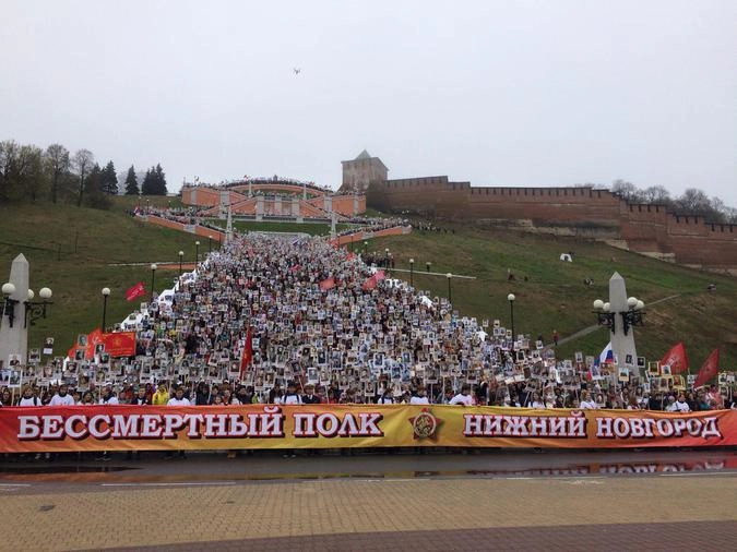 В Нижнем Новгороде 9 мая состоялось массовое шествие «Бессмертного полка», которое началось сразу после окончания Парада Победы. Участники акции собрались в колонны на Верхне-Волжской набережной, прошли по площади Минина и Пожарского и спустились к Чкаловской лестнице – одному из главных нижегородских памятных мест Великой Отечественной войны. Там были спеты песни военных лет.