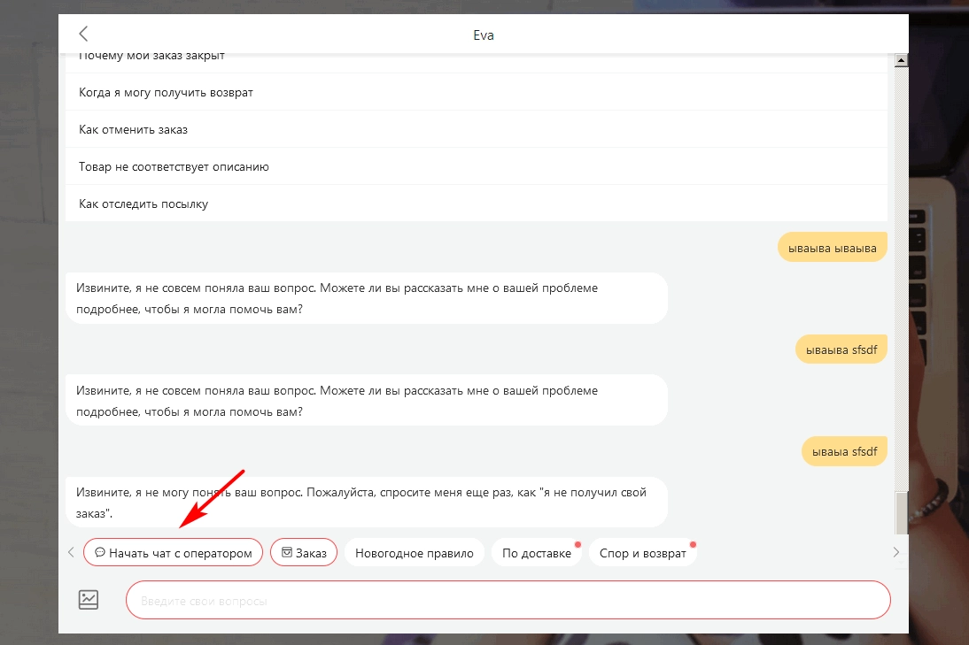 Ещё сложнее пробиться к живому человеку в чате поддержки Aliexpress, но однажды меня научил этому один из работников этой самой поддержки. Нужно много (иногда несколько десятков раз) писать в чате любое бессмысленное сочетание букв. На каждое робот будет отвечать «Извините, я не совсем поняла ваш вопрос…», но рано или поздно внизу появится вожделенная кнопка «Начать чат с оператором».