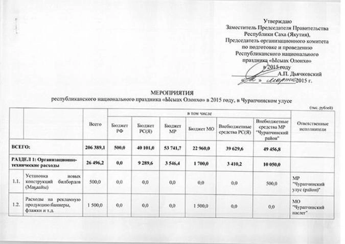 По плану предусмотрены затраты в сумме 206 млн рублей. Из них бюджет республики выделил – 40,101 млн рублей, районный и местный бюджеты - 76,70 млн рублей. Фонд развития Чурапчинского улуса «Олонхо» должен собрать - 89,08 млн рублей.