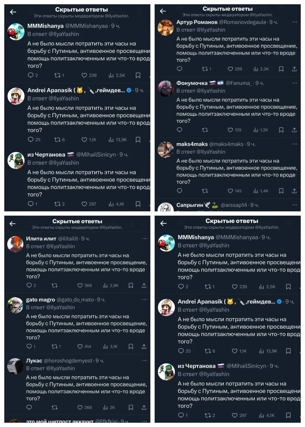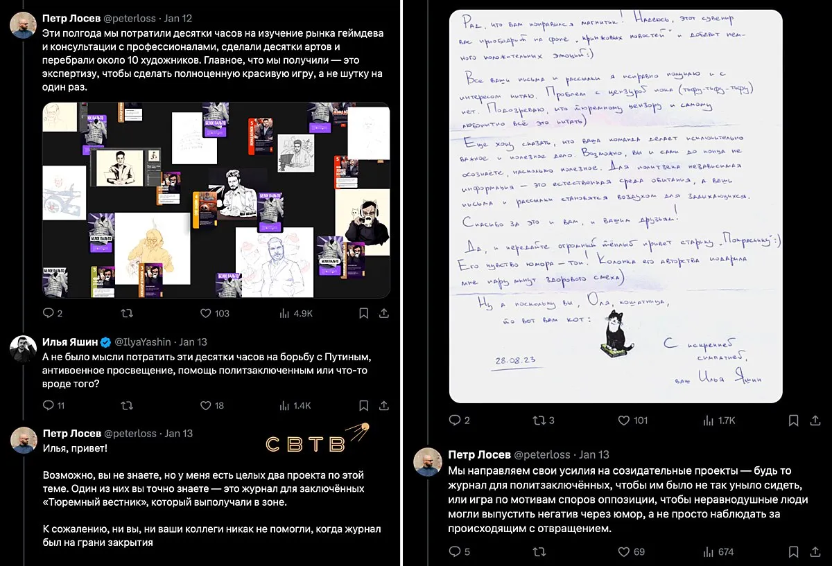 В комментарии к Лосеву тут же пришел Яшин* и упрекнул его, что вместо создания игры тот мог бы заняться чем-то более полезным — например, помощью политзаключённым. Тут же выяснилось, что Лосев — издатель ежемесячного журнала для политзаключённых, который читал в том числе и Яшин*.