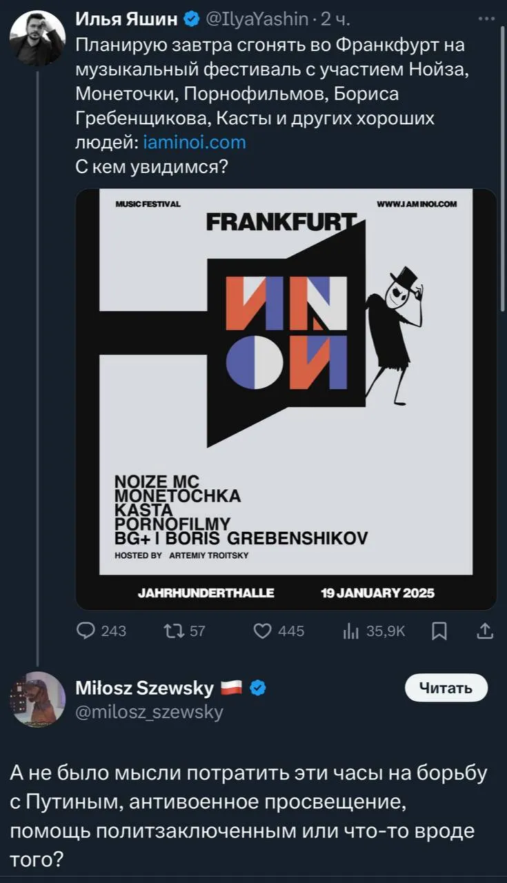 Восемнадцатого января Яшин* объявил, что собирается отправиться на сборный концерт музыкантов из числа других иноагентов, политэмигрантов и прочих врагов Российского государства: Noize MC***, Монеточки****, Владимира Котлярова***** и рок-группы «Порнофильмы», Бориса Гребенщикова******, группы «Каста».