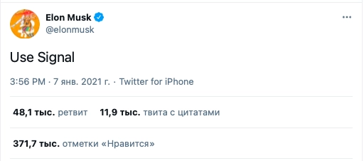 Так, стоимость акций компании Signal Advance выросла на 618% после того, как основатель SpaceX Илон Маск написал в Twitter: «Используйте Signal». Таким образом экстравагантный миллиардер отреагировал на новую политику конфиденциальности WhatsApp, который должен теперь передавать данные своих пользователей корпорации Facebook. Маск полагает, что мессенджер Signal — лучшая альтернатива сервису WhatsApp.
