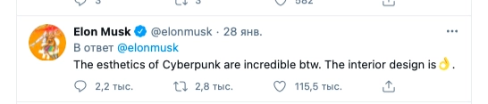 Похожий трюк Илон Маск провернул с компанией CD Projekt — создателем компьютерной игры Cyberpunk. Он написал в ветке комментариев к посту об электрокаре Tesla Model S Plaid, что в «автомобиле можно играть в Cyberpunk». А после добавил: «Эстетика игры Cyberpunk невероятна». В результате акции CD Projekt подскочили на 19%. По данным Bloomberg, подобного роста у компании не наблюдалось с 2015 года.