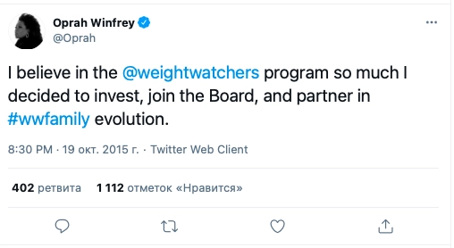 «Я настолько верю в программу для похудения, разработанную компанией Weight Watcher, что решила инвестировать в это предприятие свои деньги и войти в совет директоров», — проинформировала свою аудиторию Уинфри.