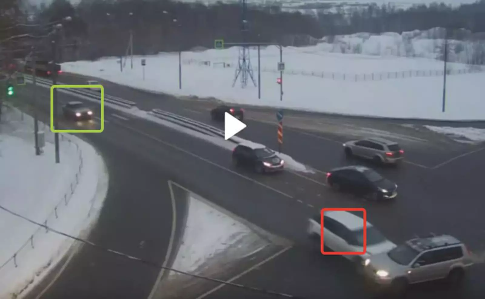 Посмотрите на скриншот момента столкновения. Обращу ещё раз внимание, что расчетное положение «Мазды» (исходя из скорости потока) должно было быть там, где зелёный квадрат (это очевидно, так как «Мазда» обогнала машину, обведенную зеленым).