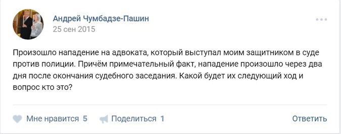 «Я жаловался и на бездействие прокуратуры в сфере защиты жилищных прав детей-сирот, я жаловался и на неправомерные действия органов опеки в наш адрес, мы яростно сопротивлялись их желанию поместить нашу недееспособную дочь в психинтернат на всю жизнь, я стараюсь стоять на позиции защиты прав моих подопечных детей и в первую очередь защиты их конституционного права жить и воспитываться в семье», — так объясняет Андрей Чумбадзе-Пашин возможные причины для столь пристального интереса к своей персоне со стороны прокуратуры и опеки.