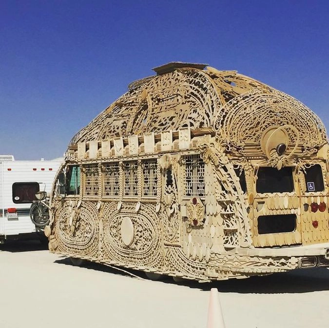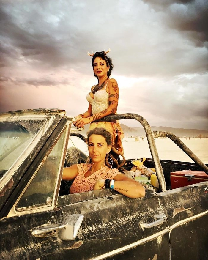На территории фестиваля запрещены обычные автомобили. Здесь передвигаются или на велосипедах, или на арт-карах — творчески преобразованных механизмах, машинах-мутантах, внешний вид и размер которых ограничен только фантазией и возможностями участников. Энтузиасты покупают или находят на помойках старые школьные автобусы и делают из них машины-акулы, космические шаттлы, пиратские корабли, утюги с крыльями или осьминогов на колёсах. Сюрреалистические кадры из фильма «Безумный Макс» внезапно оживают и становятся реальными.
