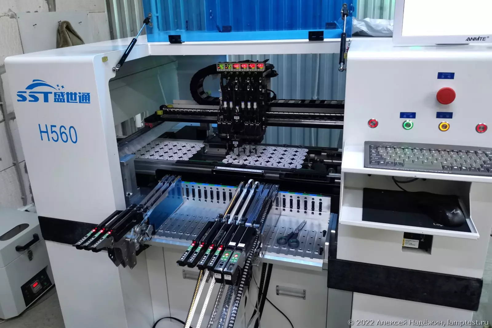 В этом цехе изготавливают платы со светодиодами и драйверами. Автоматический установщик размещает детали на плате.