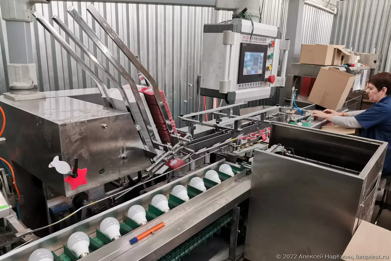 На линии упаковки автомат собирает коробку, кладёт туда лампу и инструкцию и запечатывает коробку. Оператору остаётся только сложить упакованные лампы в большие картонные коробки.