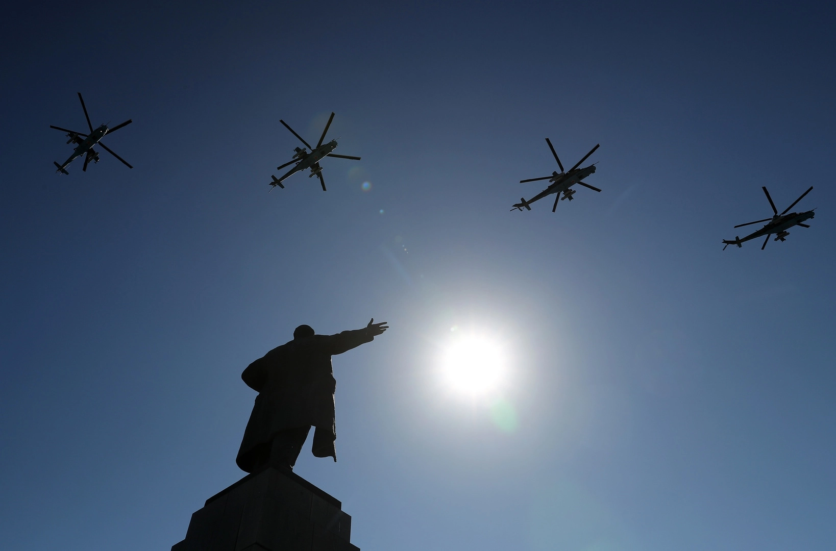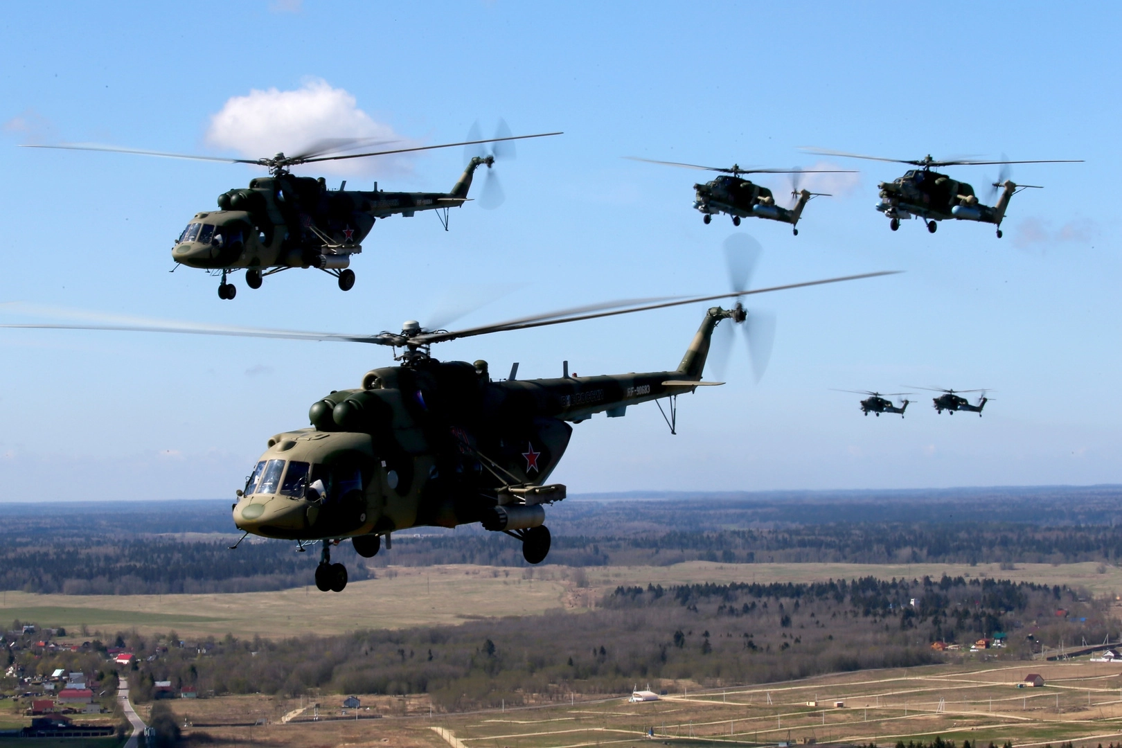 Над Москвой пролетели такие виды техники, как военно-транспортный вертолет Ми-26, четыре многоцелевых Ми-8АМТШ, пять ударных Ми-35М, несколько вертолетов Ка-52, а также Ми-28Н «Ночной охотник».