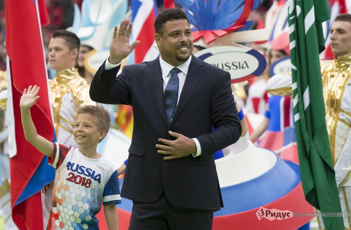 Разумеется, не обошлось и без футбольных кумиров. Икер Касильяс представил Кубок мира, великий Зубастик — Роналдо — сделал символический удар по мячу, и — понеслась.