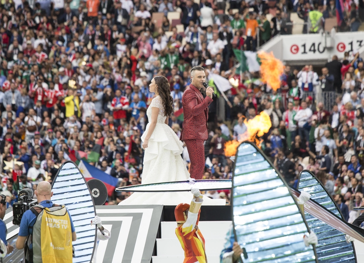 Организаторы шоу постарались на славу. ЖК-мониторы в виде щитов, сложившихся в итоге в надпись «Welcome», прекрасная хореография, футбольное дефиле, огненные спецэффекты, разложенные на зрительских сиденьях цветные картонки, которые нужно поднять в определенный момент, — буквально все заслуживает самых высоких похвал.
