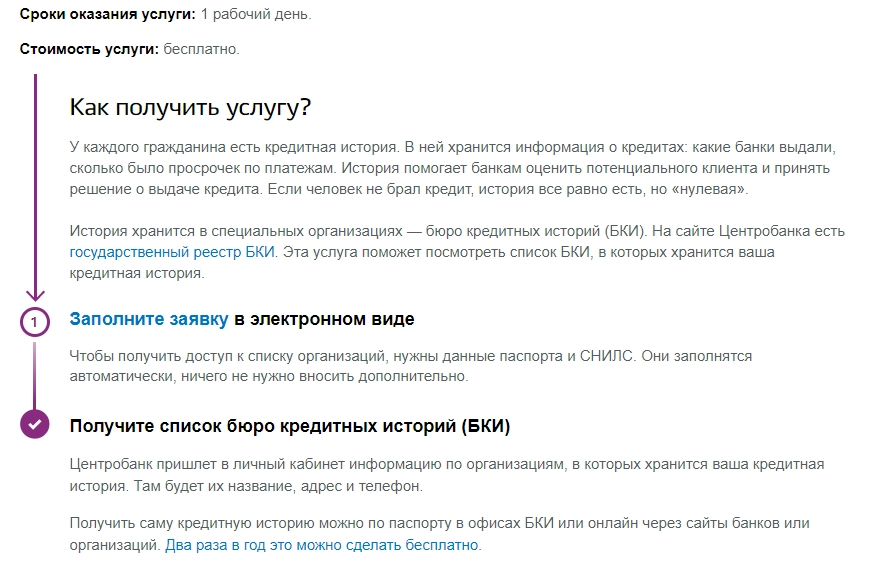 Два раза в год каждый может получить информацию о своей кредитной истории бесплатно в каждом из БКИ. Запрос можно сделать, посетив бюро лично, отправив туда телеграмму или заверенное нотариусом письмо. Удобнее всего получить свою кредитную историю онлайн с помощью авторизации через «Госуслуги». Такая функция есть почти в каждом БКИ.