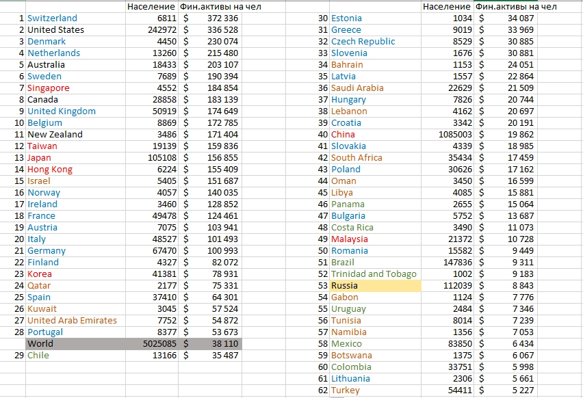 В Швейцарии каждый взрослый житель в среднем имеет 372 тыс. долларов финансовых активов, в США — 337 тыс. долларов, в Дании 230 тыс., в Нидерландах — 215 тыс., в Австралии — 203 тыс., в Швеции — 190 тыс., в Сингапуре — 185 тыс., в Канаде — 183 тыс., в Великобритании и Бельгии — по 172 тыс.