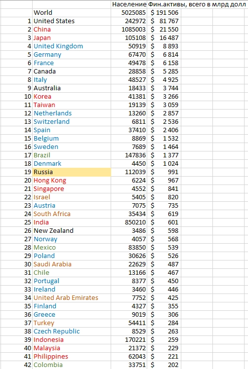 В списке указаны только те страны, которые имеют свыше 200 млрд долларов финансовых активов на руках у населения.