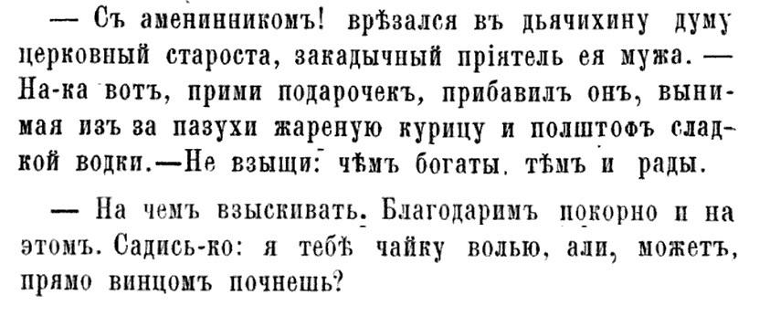 Эти слова из повести русского писателя-народника Александра Левитова (1835−77) под названием «Именины сельского дьячка» как нельзя более ярко рассказывают об этом простом, но таком близком каждому человеку празднике. Что только не приносили гости в день ангела: гусей и петухов, пряники и конфеты.
