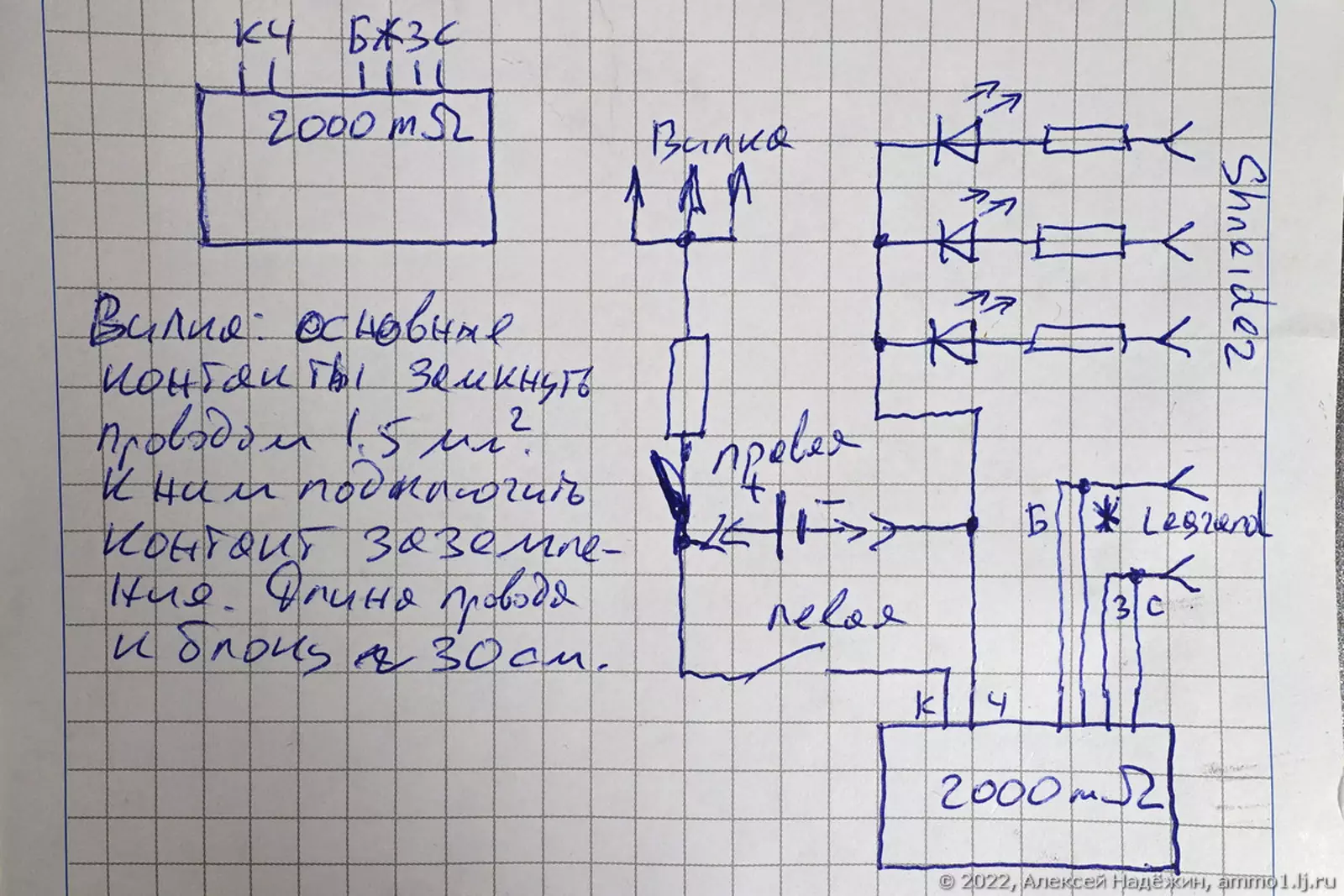Вот нехитрая схема тестера. Дополнительный резистор на проводе от вилки нужен для защиты измерителя сопротивления (если сдуру воткнут тестовую вилку в левую розетку и нажмут правую кнопку).