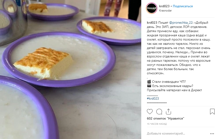 Детям принесли еду, как собакам: жидкая прозрачная каша (одна вода) и омлет, который просто положили в кашу, так как не хватило тарелок. Никто из детей завтракать не стал, персонал очень удивился, почему. Нелюди… — написала родительница.