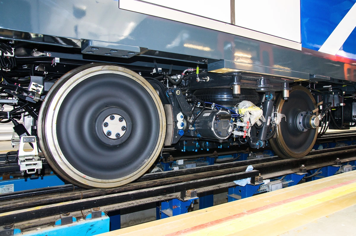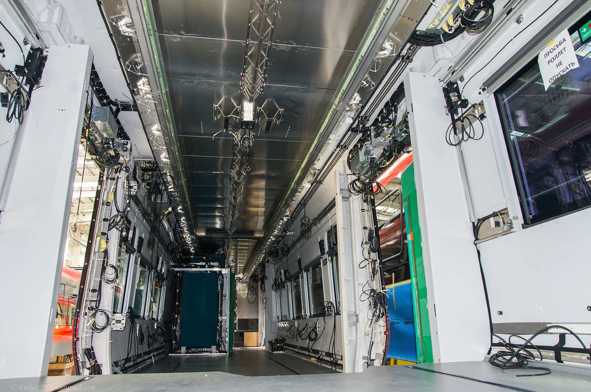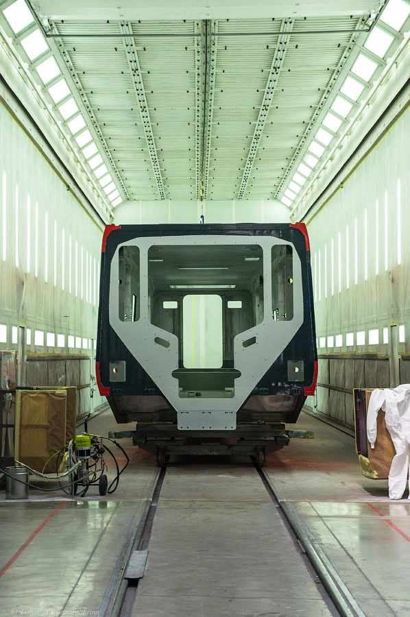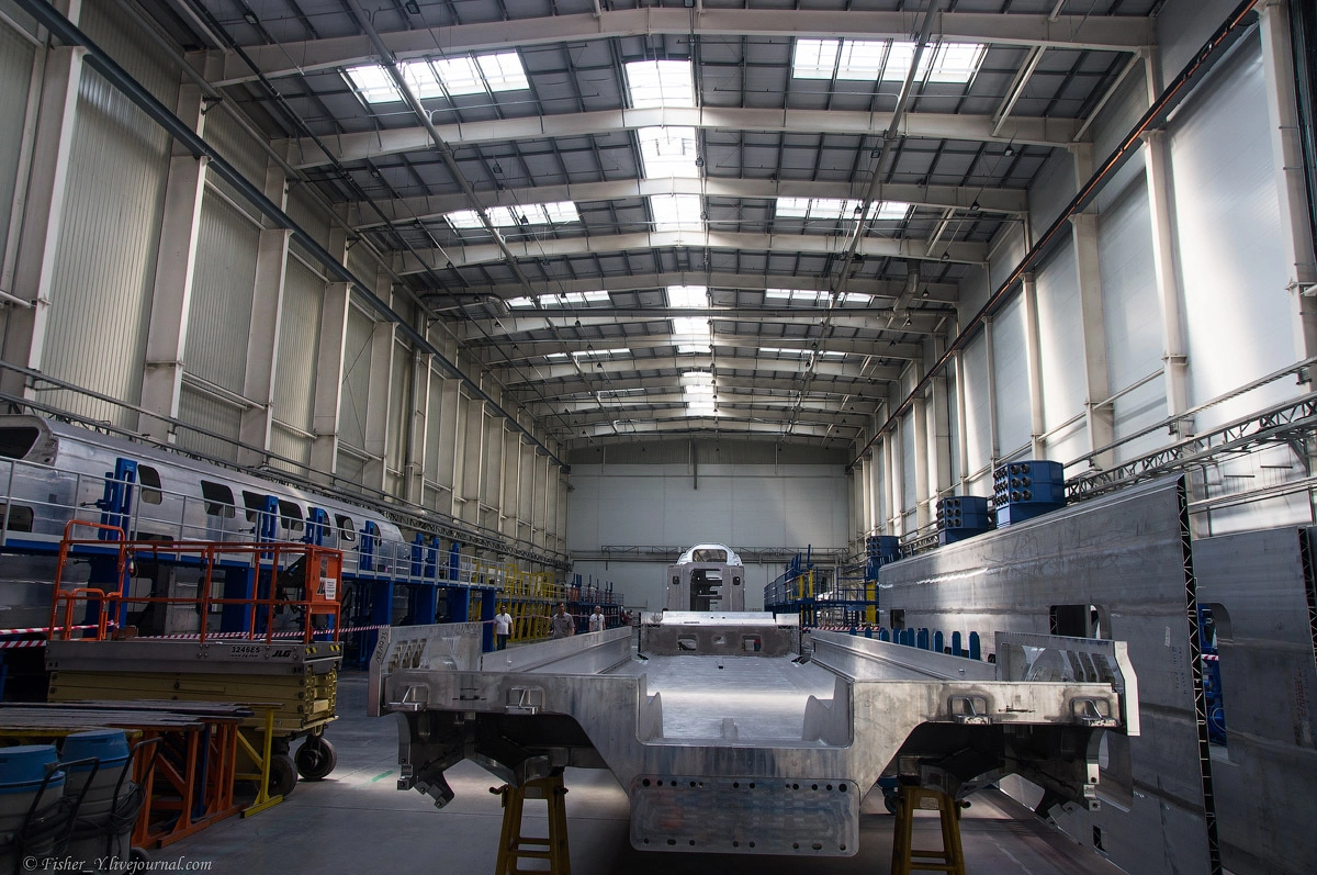 47. Ну, а мы, тем временем, проследуем в цех запуска. Внутри цеха проложены 2 пути длиной 190 метров. Здесь происходит запуск подвижного состава. Сначала статический, запуск механического оборудования (отопители, двери, вентиляция, подъемники). Потом динамические испытания тяговых компонентов (тормозные системы, двигатели, конвертеры). В среднем запуск одного состава занимает около месяца