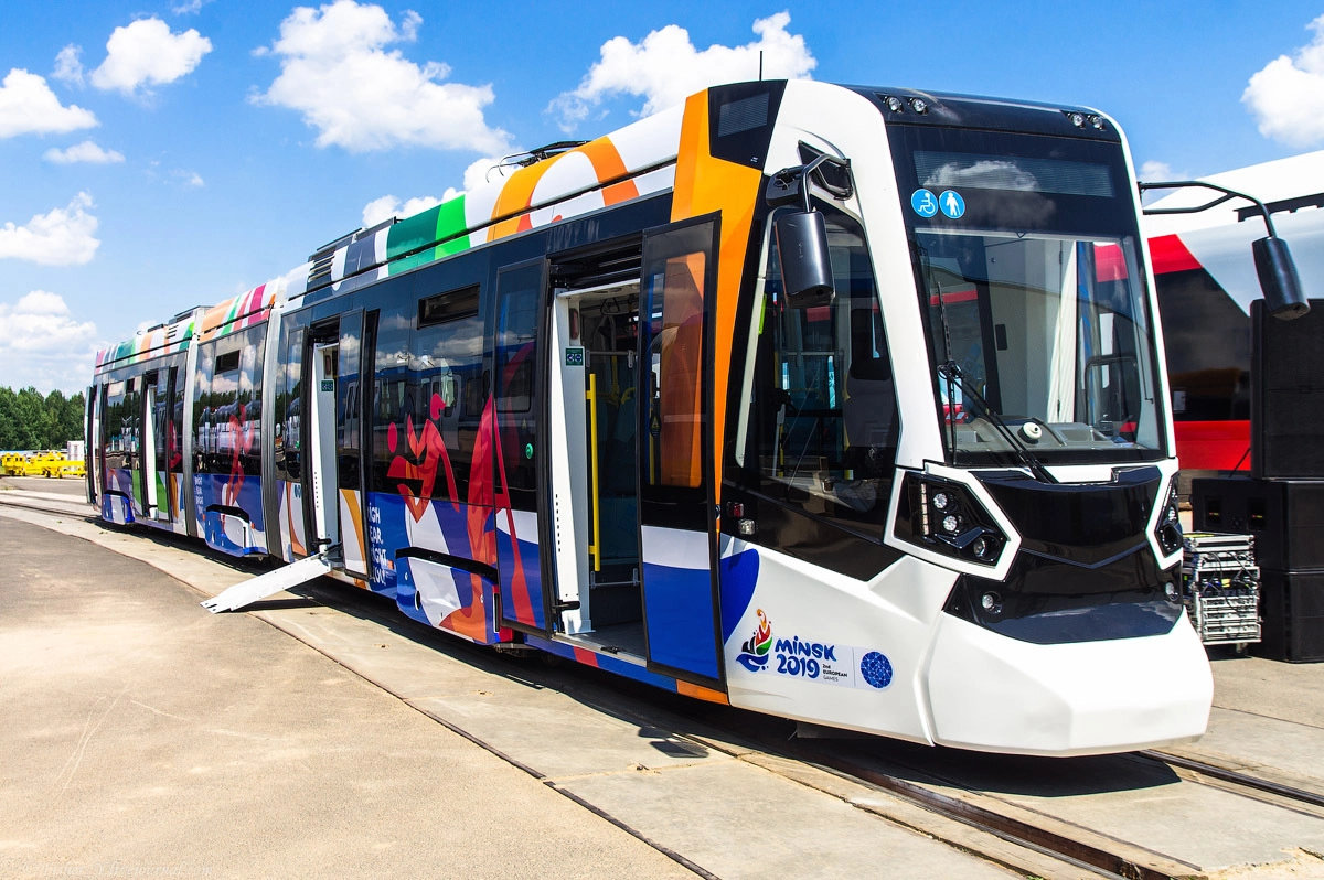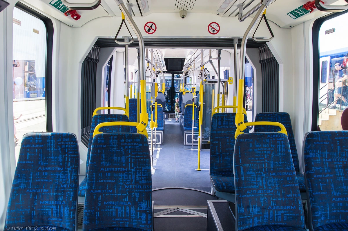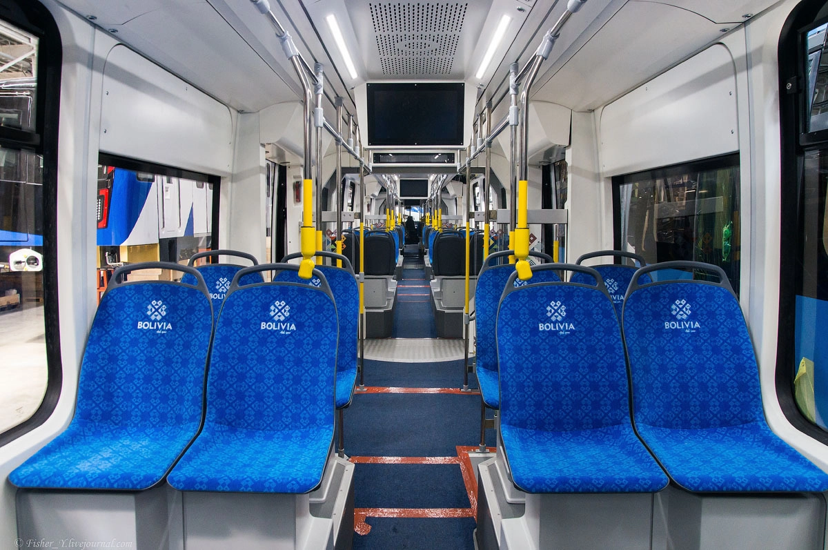 34. Трамвай «Метелица». Ранее подобные трамваи (вагон В85600М) поставлялись в Санкт-Петербург под наименованием «Чижик». Данная версия (вагон В85601М) поставляется в боливийский город Кочабамбе. От «Чижика» данная версия отличается примерно на 30 см удлиненной средней частью,