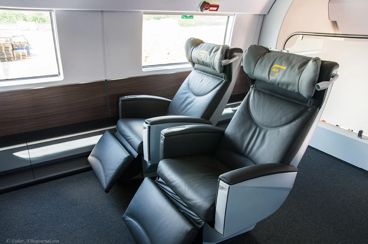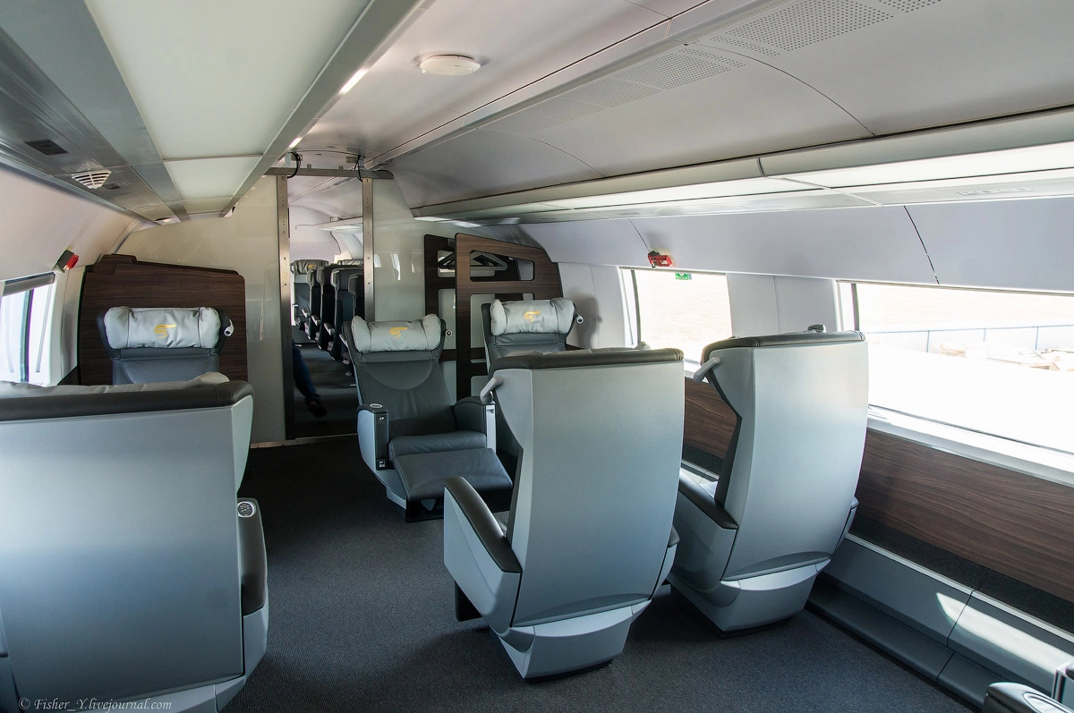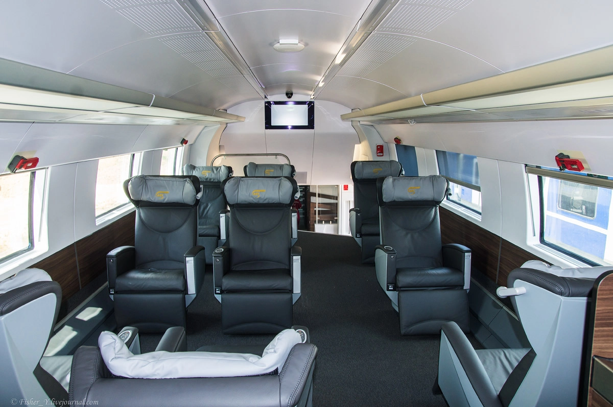 Время в пути всего 40 минут, поэтому довольно удивительно видеть настолько роскошный салон. Вероятно именно этот поезд предназначен для нового маршрута Баку — Гянджа. Всего в составе из четырех вагонов 367 сидячих мест, в том числе первого класса (9 мест), бизнес-класса (62 места) и класса стандарт (296 мест). Насколько я понял, первый этаж в головном вагоне представлен бизнес-классом.