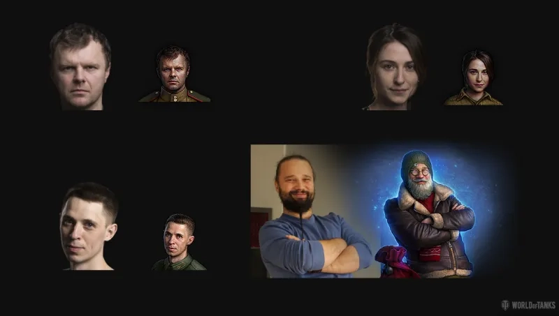 Егор Блинцов: Возникновение идеи рисовать экипажи на основе реальных людей, а не стоковых фоток (или, к примеру, на основе нейронки) довольно банально — это в первую очередь права на использование. С коллегами, особенно при их заинтересованности, договориться гораздо проще. Дополнительный фактор «в плюс»: процесс этот более контролируемый: можно поставить свет, позу, скорректировать мимику под желаемый результат. Кроме того, возможность стать «лицом» танкового экипажа — это колоссальная мотивация, а для кого-то из коллег и своеобразная мини-игра: собрать экипаж из своих коллег, знакомых, друзей. Что касается знаменитостей, тут процесс гораздо более сложный. Но при этом и результат весомее — Чака Норриса, к примеру, знают все, а моего замечательнейшего коллегу из гейм-дизайна — далеко не все. А жаль.