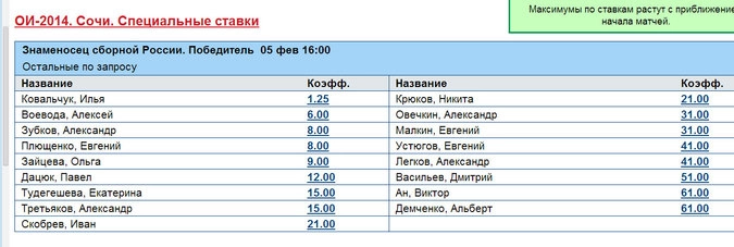 Ставьте на фаворитов в отборе, пусть коэффициенты на них будут небольшие, но это «верняки». Присматривайтесь к открытиям. Новички, которые показывают стабильные результаты в отборе, должны составить серьезную конкуренцию фаворитам. А это неплохой коэффициент. В хоккее лучше ставить на «тоталы»: например, наша сборная в групповом турнире любит отгружать «больше». А вот канадцы и шведы, по традиции, экономят силы и ждут самых важных матчей. В конькобежном спорте явный лидер только — Свен Крамер. Биатлон — это самая непредсказуемая дисциплина, где можно предугадать только командную эстафету, но там и на норвежских мужчин коэффициент будет небольшой. А самая интересная ставка — кто станет знаменосцем нашей сборной. Фаворит — хоккеист Илья Ковальчук, у него, соответственно, самый низкий коэффициент — 1,25. Идущий на втором месте бобслеист Алексей Воевода идёт с «кэфом» 6.00. У его напарника Алексея Зубкова и фигуриста Евгения Плющенко коэффициент 8.00. Наверняка, наверху вопрос этот уже давно решили. Интересно, люди, которые «в теме» уже занесли букмекерам?