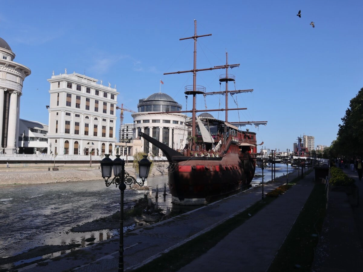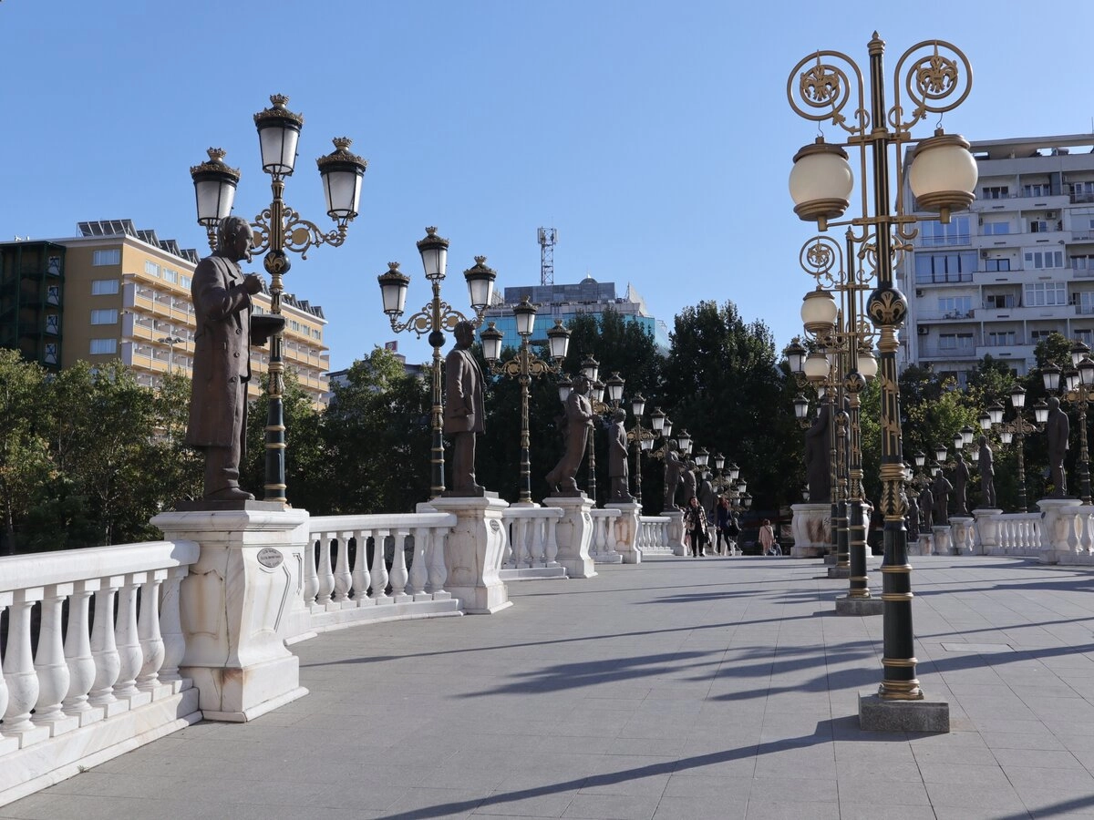 Два пешеходных моста, а вместе с ними и одна из набережных уставлена рядом однотипных памятников всяких македонских деятелей, перемежаемых дешёвыми фонарями будто со строительного рынка.