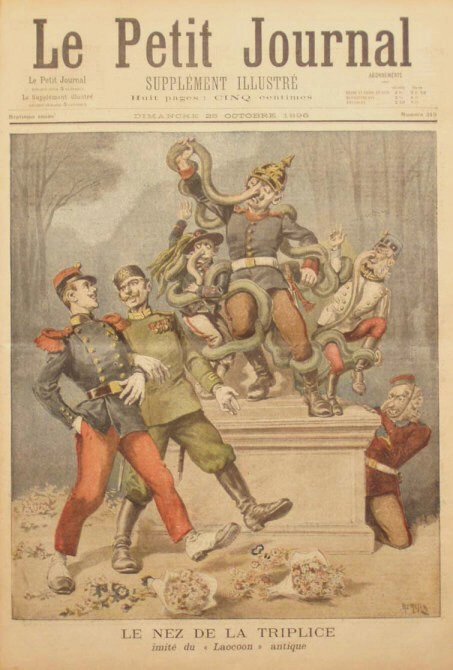 1896 год. Карикатура на Тройной альянс (он это статуя), а Россия и Франция весело идут под ручку мимо.