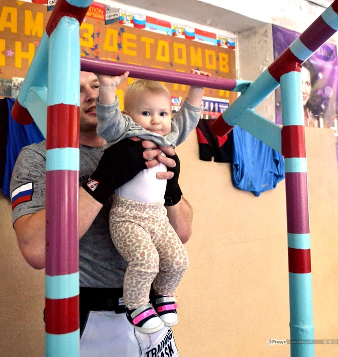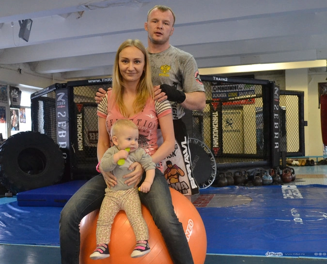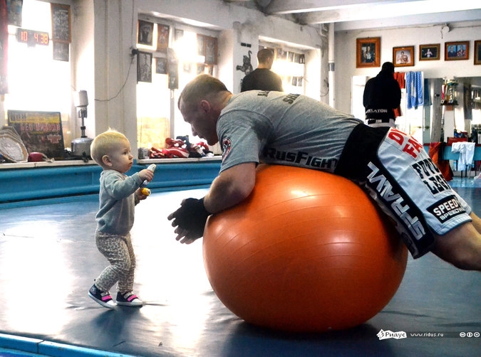 Пока мы беседовали с женой Александра, маленькая Ангелина, вооружившись диктофоном, активно брала собственное интервью у спарринг-партнеров своего отца. Малышка в спортзале чувствует себя вполне комфортно, и дерущиеся вокруг атлеты ее явно не смущают. В перерывах между упражнениями Александр старается уделить пару минут своему чаду.