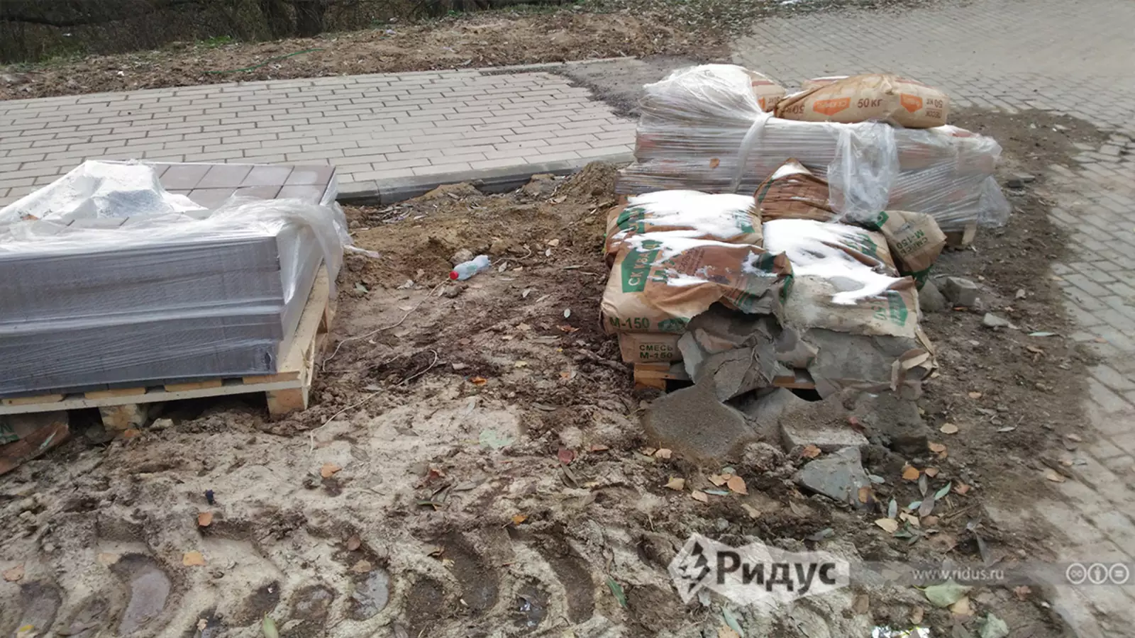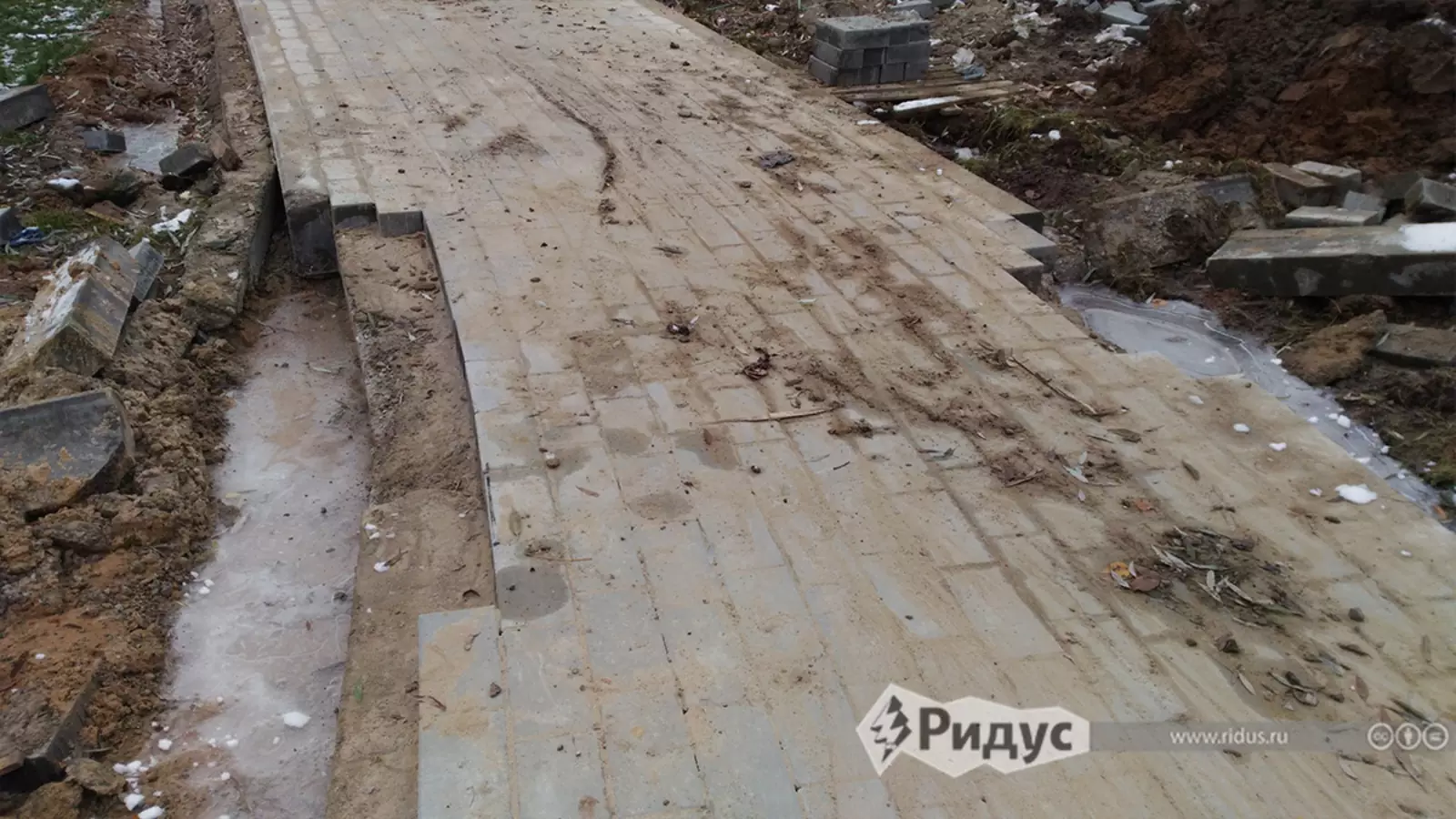 Отсутствие стока вызывает образование настоящих болот перед такими дорожками. Прошло больше трёх лет, но в редкой траве до сих пор видны засохшие следы гусениц, попадаются бетонные блоки и арматура. Большое количество строительных материалов во время «благоустройства» было разбросано вокруг плиточных дорожек. Сворачивая стройку, убрали далеко не всё. Что-то просто закапывали.