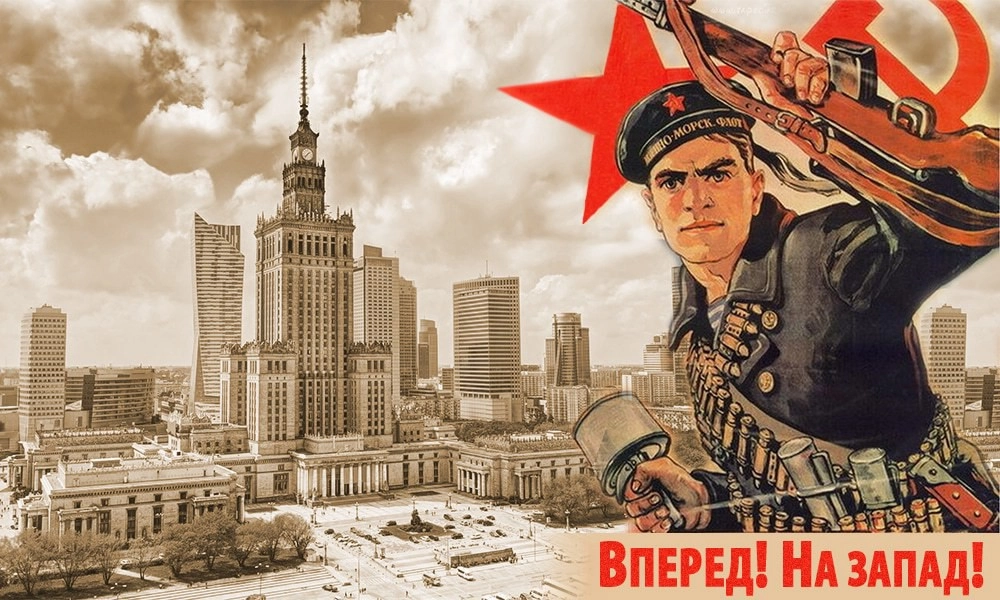 Материал проиллюстрирован картинкой, на которой моряк с советского плаката размещен на фоне Варшавы.