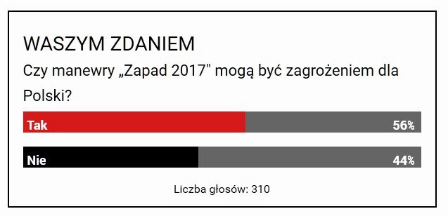Из этих опросов следует, что только 30—40% польских читателей верят в агрессивные намерения России. В целом же можно констатировать, что, несмотря на оголтелую антироссийскую шумиху в СМИ вокруг учений «Запад-2017», значительная часть поляков смогла сохранить здравый смысл. Об этом также свидетельствуют их комментарии под статьями.