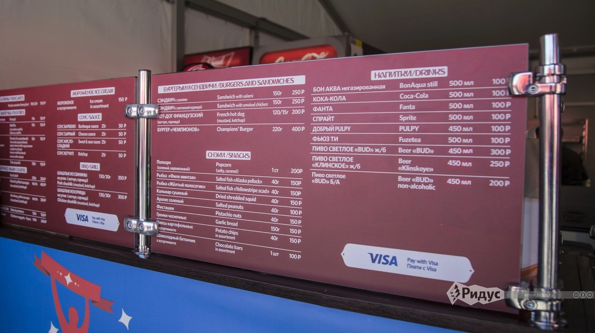 Цены на фаст-фуд и пиво — ниже, чем на спортивных площадках, но тоже ничего себе. Хотдог — 200 рублей, пинта пива — от 250 за «Клинское». Безалкогольные напитки идут по «сотке».