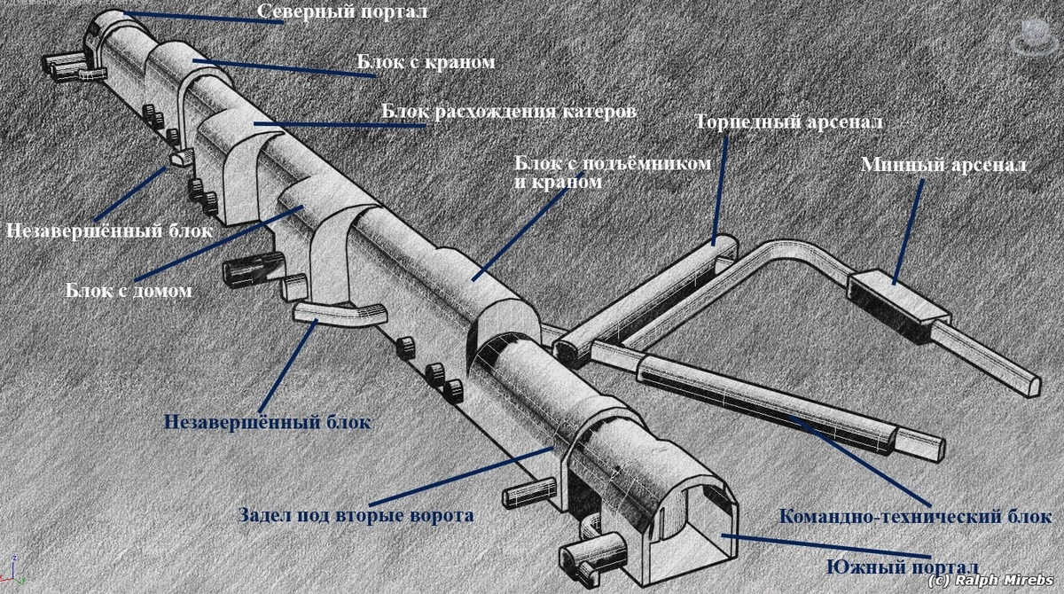 Наверное, это связано с тем, что в случае военных действий удар бы пришёлся по бухте, по наземным сооружениям базы, а именно к ним выходит южный портал. Именно поэтому со стороны наиболее вероятной атаки планировали установить дополнительные защитные ворота.